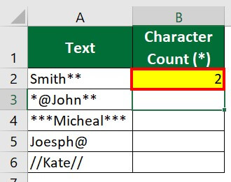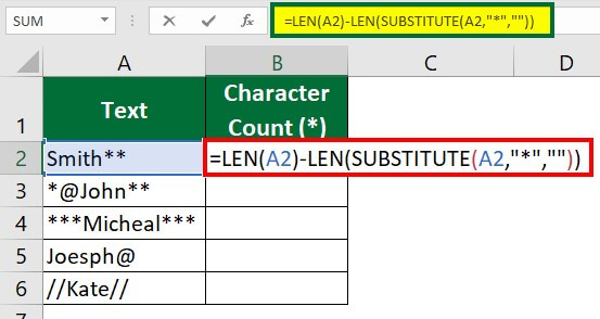 - This formula “=LEN(A2)-LEN(SUBSTITUTE(A2, “*”,””))” will subtract 7 from 5 and will give 2. The output is the number of character “*” occurrences in Cell A2.