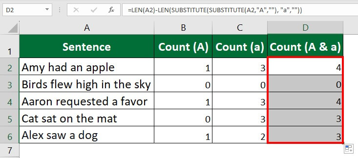 You must have understood the case-sensitive nature of the SUBSTITUTE function. Now, let’s calculate the total count of A and a, considering both uppercase and lowercase.