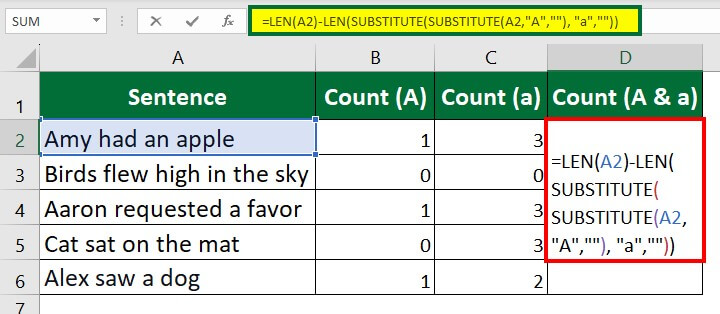 =LEN(A2)–LEN(SUBSTITUTE(A2,”A”,””))+LEN(A2)–LEN(SUBSTITUTE(A2,”a”,””))