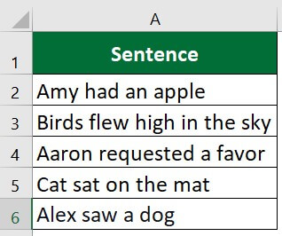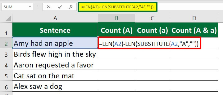 Consider the below data of some random sentences. Here you want to know the count of letters A/a using LEN and SUBSTITUTE functions. You want the function to give the total count of A and a, considering both uppercase and lowercase.