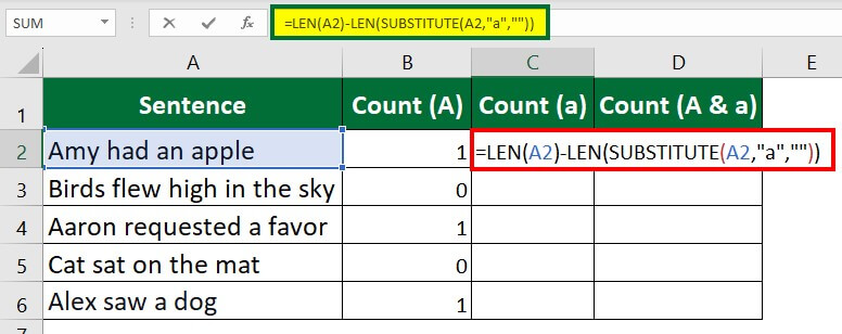 =LEN(A2)–LEN(SUBSTITUTE(LOWER(A2), “a”, “”))