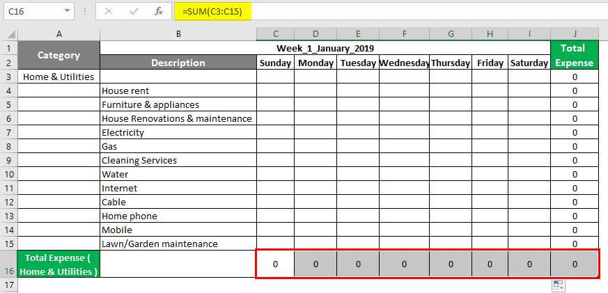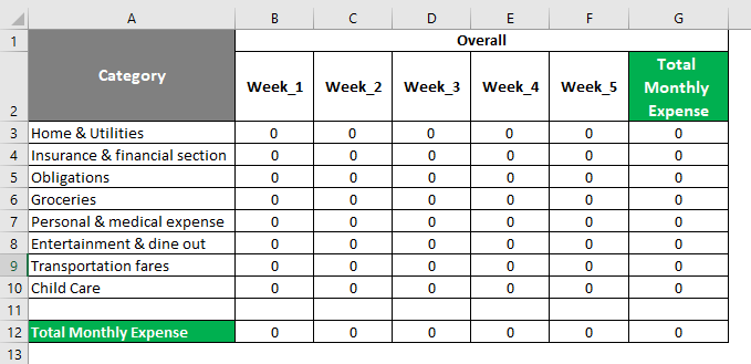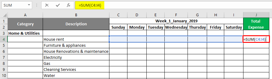 Now, you can add these in Excel with each category separately & need to create a category-wise batch. If we create a monthly expense tracker, we must create day-wise for each week, i.e., 5 sheets for 5 weeks. Let’s create for week 1 with a day-wise breakup. The category section in column A, i.e., adds each category and its total expense.