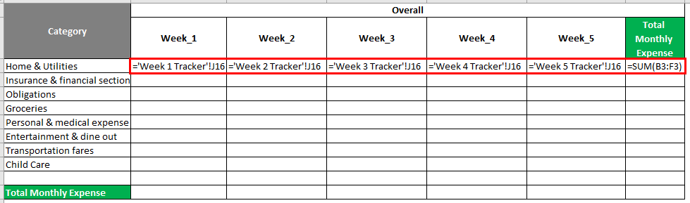 You can create a table, category wise, where you need to link each cell to the weekly category total expense for each week. Let’s link the cell reference for week 1; for cell “C4”, you need to link it to cell “J16” of the Week 1 Tracker sheet, i.e., It is a Total expense of the home & utility category for week 1.