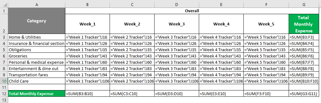Simultaneously, all the weekly category total expenses are linked to relevant cells. In row 12 & column G, you can do the sum for a weekly category total expense.