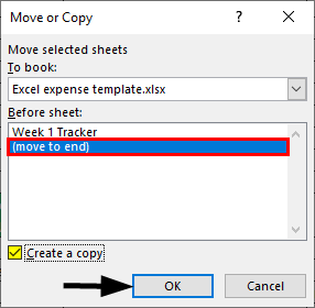 Once you click “Move or Copy”, its window appears; check the box to create a copy & click on the move to end. So that another copy of the weekly tracker is created so that you can name that sheet “Week 1 Tracker“.