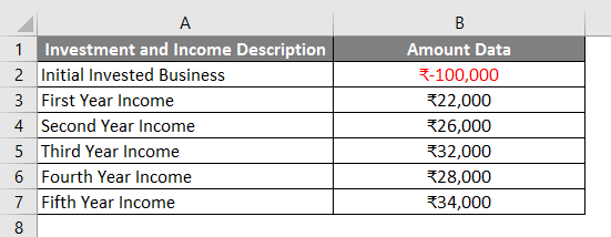 - Open MS Excel and go to sheet1, where the user wants to calculate the company’s internal rate for the 5-year data in the table.