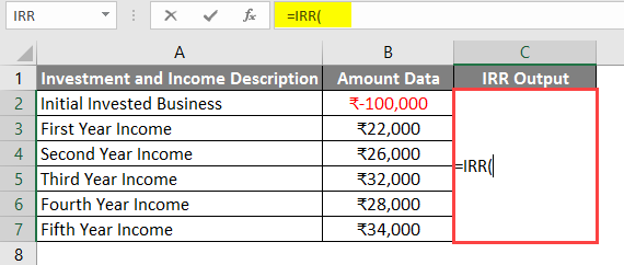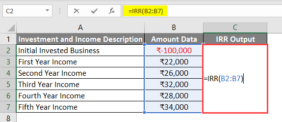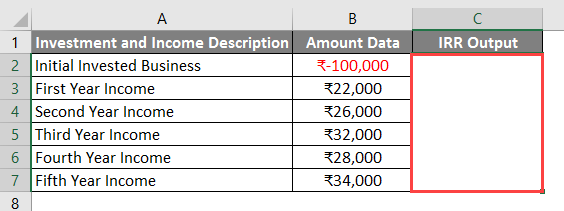 - Create a header column with IRR Output in Column C, in which we will function the result.