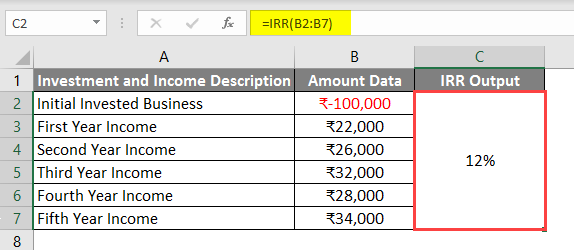 The user wants to Calculate the Internal Rate of the Return for a company, where 5-year investment and income details were given. So, as a result, we can see the result is 12%. In 5-year, time frame 12 % is the rate of the return for the company.