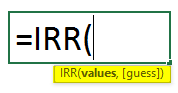 - Values: It is a mandatory field in which a user wants to calculate the internal rate of the return. Initially, all investments will be negative, and all generated revenue will be positive.