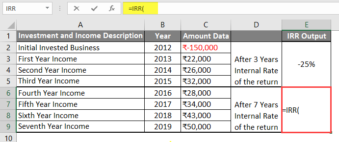 Let’s see how the ‘IRR’ function can solve this problem to calculate the company’s internal rate for the 7-year data.