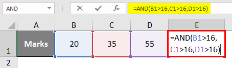 Step 2: We need to specify logical criteria under AND function. Use criteria as cell value greater than 16 for all cells (B1, C1, D1). You can use a comma as a separator to separate the multiple criteria conditions. See the screenshot below: