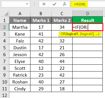 Step 4: Add the [value_if_true] as “Pass” under the formula in cell D2 to specify that if at least one condition gets satisfied, a student is a pass.