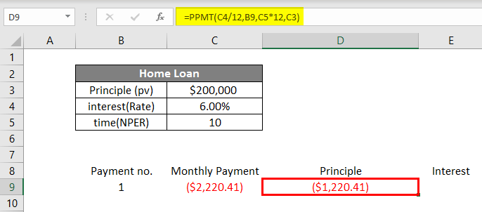 This shows that in the monthly payment of $2,220.41, $1,220.41 is the principal part, and $1,000 is the interest. Here is another example to get more clarity on the above-discussed functions.