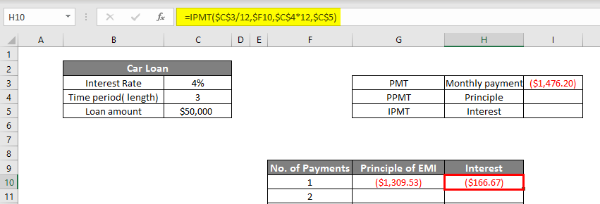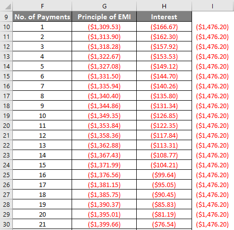 So now we get $1309.53 as PPMT and $166.67 as IPMT, which will add $1476.20 (monthly payment). To show all the payments, we will make the values dynamic in both PPMT and IPMT functions, as shown below.