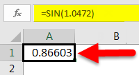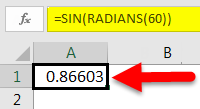 As you can see from the above screenshot, the SIN function in Excel expects a number as an input. This number usually represents a value in radians. So, in this case, we will write “=SIN(1.0472)”, where 1.0472 is the radians equivalent of 60 degrees.