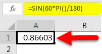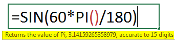Next, we will directly pass 60° as the argument to the SIN function. But this wouldn’t give us the corresponding value of 60 degrees in radians. Hence we will multiply 60 by PI()/180.