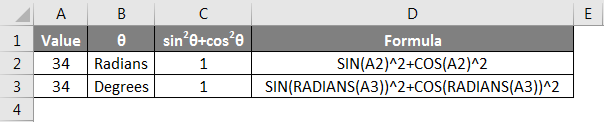 By default, SIN 45 = 0.85 is the SIN of 45 radians; excel takes all the angles in radians and not degrees. To convert it into a degree, we can use the radian function and get a SIN of 45 degrees, as shown in the last row. i.e. SIN(RADIANS(45)) = 0.707 or 0.71