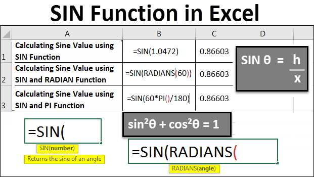 The sin function of Excel is another mathematical function that gives the Sine value of any angle or radian value of an angle. We all know that Perpendicular mathematically calculates the Sine angle to Hypotenuse, but that provides the logic of the Sine angle. To calculate the Sin function, we need to feed the value with the radians function or multiply the angle by Pi()/180 to get the actual value.
