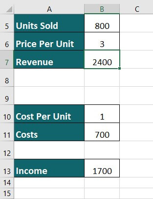 Let’s say you sold 800 units of a product at $3 each, earning a revenue of $2400. Now, you want to make $3000 next month. To reach this goal, let’s see how we can use Excel’s Solver feature to find the best price per unit and the number of units sold.