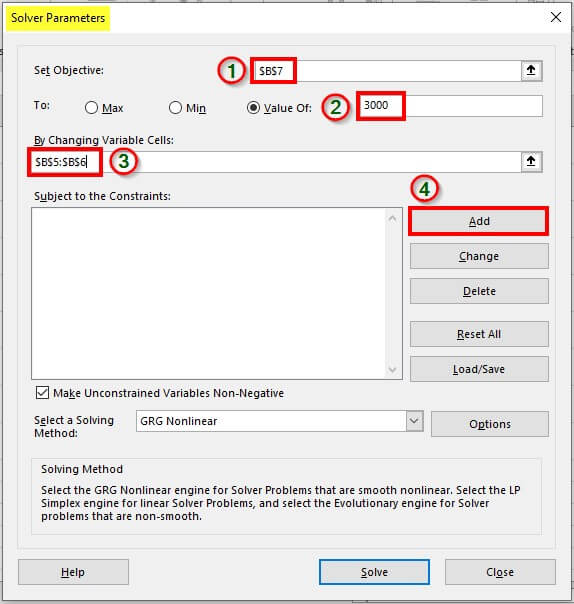 - Set Objective: Select the cell where you want to display the new value (cell B7)
