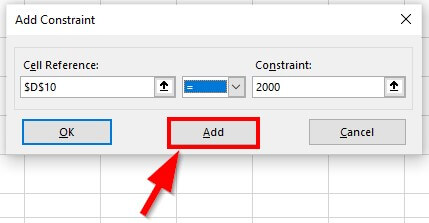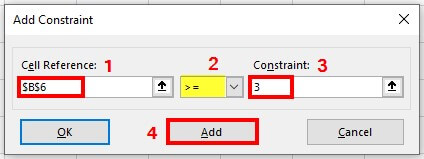 To do this, enter the cell reference as $B$6, select >= sign from the drop-down, enter the constraint as 3, and click “Add“.