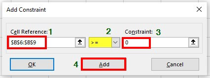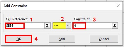To do this, enter the cell reference as $B$6, select <= sign from the drop-down, enter the constraint as 4, and click “OK“.