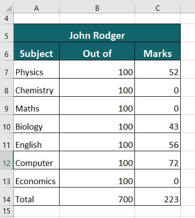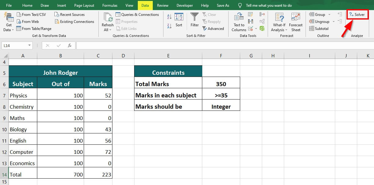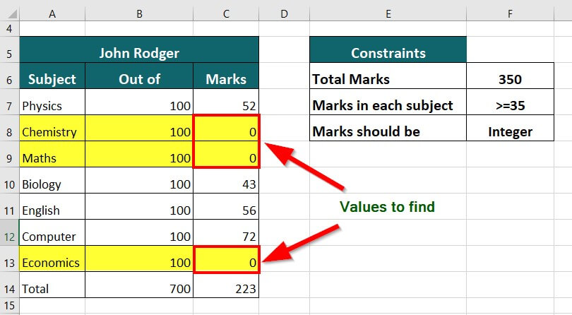 John got 223 marks in Physics, Biology, English, and Computer exams but missed the Chemistry, Maths, and Economics tests. He is exempted from retaking the missed exams but needs to score 350 marks overall. Let’s understand how he can use the Solver tool to determine the marks required in each of the three subjects.