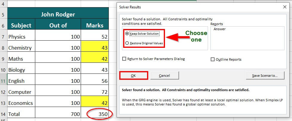 Step 6: We will click “Keep Solver Solution” and then “OK” to update the values and close the Solver Results dialog box.