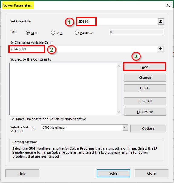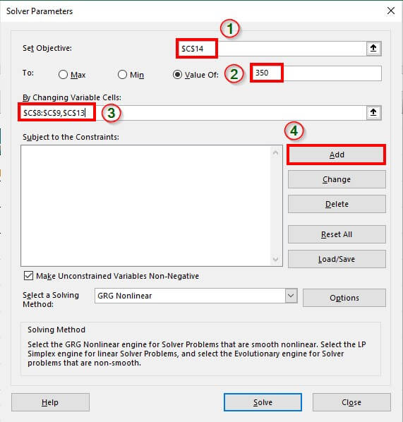 - Subject to the constraints: To obtain the desired outcome, define the conditions or limits under which Solver will operate.