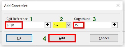 To do this, enter the cell reference as $C$8, select >= to sign from the drop-down, enter the constraint as 35, and click “Add”.