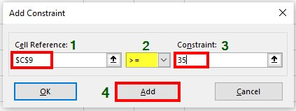 To do this, enter the cell reference as $C$9, select >= sign from the drop-down, enter the constraint as 35, and click “Add”.