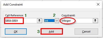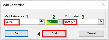 To do this, enter the cell reference as $C$9, select “int” from the drop-down, enter the constraint as an integer, and click “Add”.