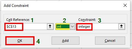 To do this, enter the cell reference as $C$13, select “int” from the drop-down, enter the constraint as an integer, and click “Add”.