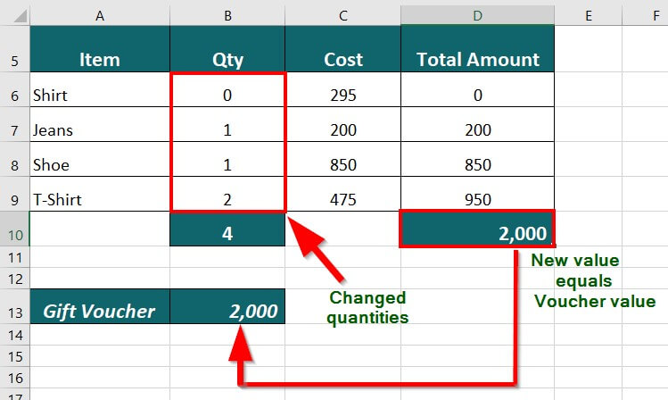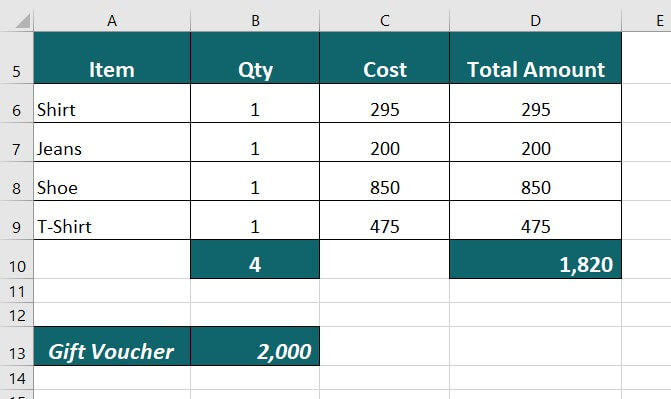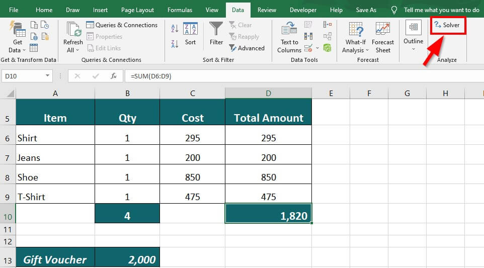 Imagine you receive a Gift Voucher worth $2,000 at a shopping mall. The list of items you can purchase using the voucher is given below, with their prices. If you buy one of each item, it costs $1,820. We want to determine how many items you need to purchase to spend the entire voucher amount of $2,000. Let’s see how we can use Solver in Excel to achieve this.