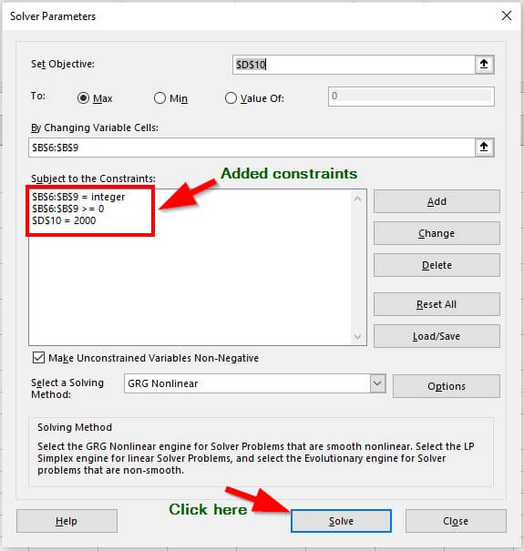 As you can see below, Excel adds the constraints to the Solver. Click Solve to tell Solver to perform its optimization operation.