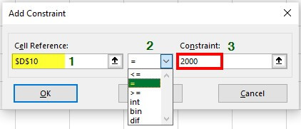 Explanation: We want the total amount (maximum limit) to be $2,000. Therefore, we enter the Cell Reference of the Total current amount, select the equal-to operator (=) from the drop-down, and enter the voucher amount as the constraint value.