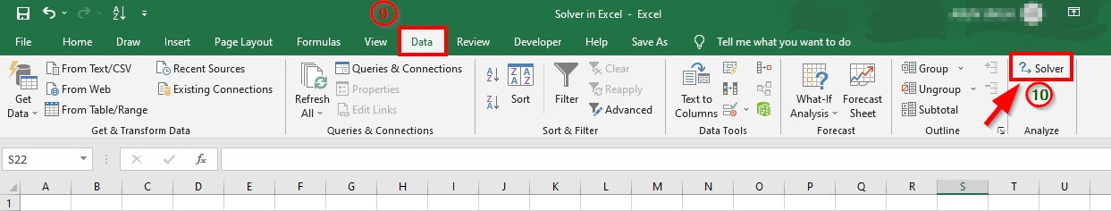 Step 1: In the Excel ribbon, go to the Data tab and click Solver in the Analyze group