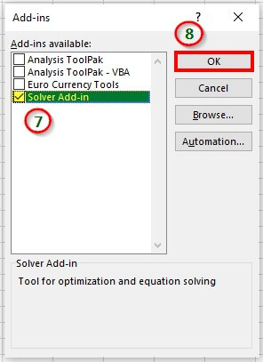 Step 4: Select the Solver Add-in checkbox and click OK.