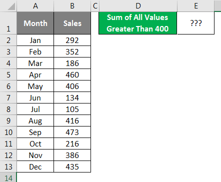 We need to do the addition of all the values which are greater than 400. For sure, we need to use the SUMIF function, but in criteria, we need to supply an operator symbol greater than (>) and mention the criteria as 400.