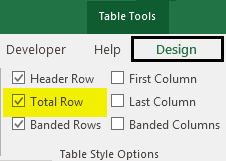 Step 2: Place a cursor inside the table > go to Design > Under Table Style Options check the option Total Row.