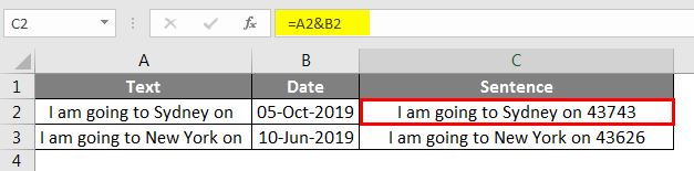 When I combined cells A1 & A2, I got the result of these two cell values. However, a date is not in the correct format; in order to make this a perfect format, we need to use the TEXT function to apply our date format.