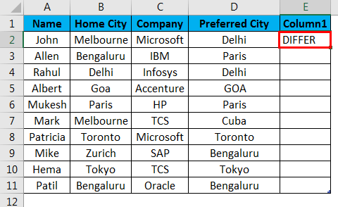 Step 2: The user wants to check Home City and Preferred City, so apply the formula in the E column to compare in Excel