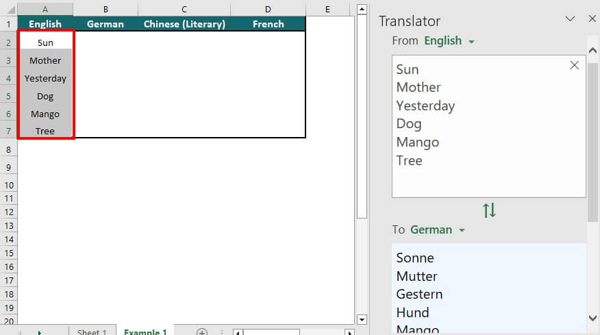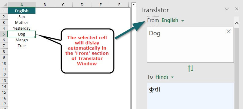 Step 2: Select the range of the cells of column A and copy in the From section of the Translator pane.