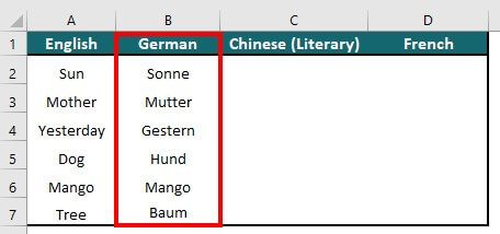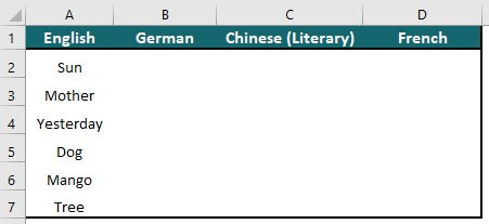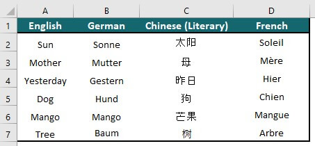 Suppose you have the below data of some words in English, and you want to translate those words into another language like Chinese and French.