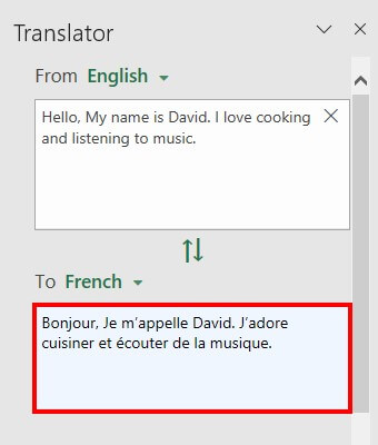 You can also change a long sentence from one language to another. For example, there is a long sentence in English -“Hello, my name is David. I love cooking and listening to music. “You want to translate this sentence into French.