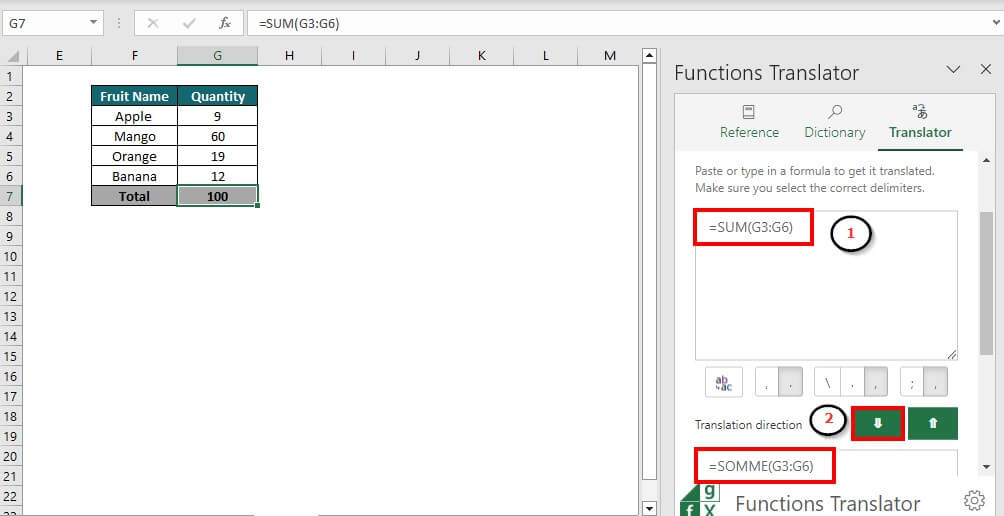 For instance, you have the below data on fruits and their quantity. Here, you want to translate the sum formula from English to French. You must enter the formula in the From box and then click on the green down arrow. The formula is translated into French, as shown below.