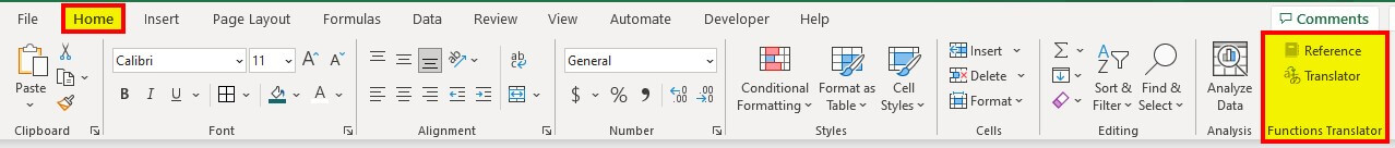 - The function Translator will appear in the Home tab. It will have two options: Reference and Translator.