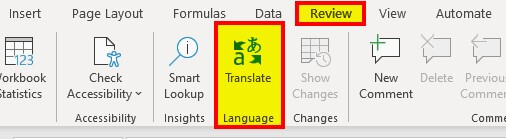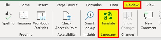In Excel, the “Translate” feature is available under the “Language” section of the “REVIEW.”