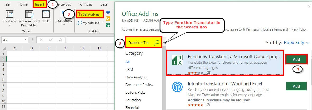 Step 3: An Office Add-ins Window will pop up. Search for Functions translator in the upper-left search section.