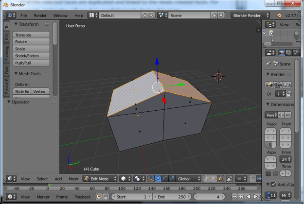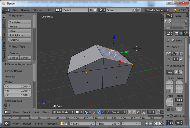 Change the radio button from vertices to edge, and then we can start editing edges. Select the edge which must be extruded and click “E” from the keyboard new edge will be created op on the existing one. Move the new edge using the cursers.